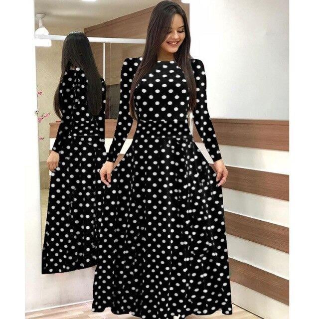 Kadın Siyah Tam Boy Beyaz Puantiyeli Elbise