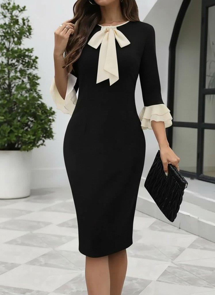 Kadın Truvakar Kollu Fiyonk Yakalı Midi Ithal Krep Elbise