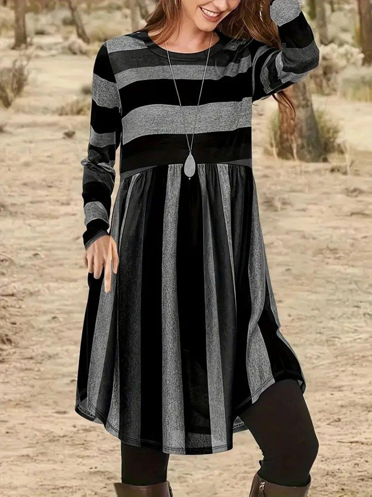 Kadın Uzun Kollu Bisiklet Yaka çizgili Desen Detaylı Süprem Mini Elbise