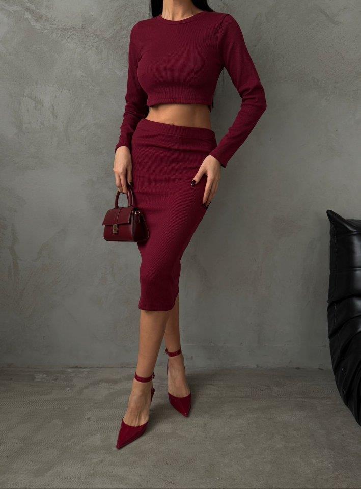 Kadın Uzun Kollu Bisiklet Yaka Crop Ve Midi Boy Kaşkorse Kumaş Etek Ikili Takım