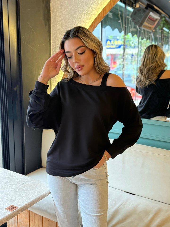 Kadın Uzun Kollu Tek Omuz Askı Detay Salaş Viskon Iki Iplik Bluz