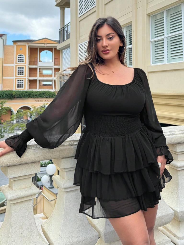 Kadın Uzun Kollu U Yaka Beli Lastikli Volanlı şifon Elbise