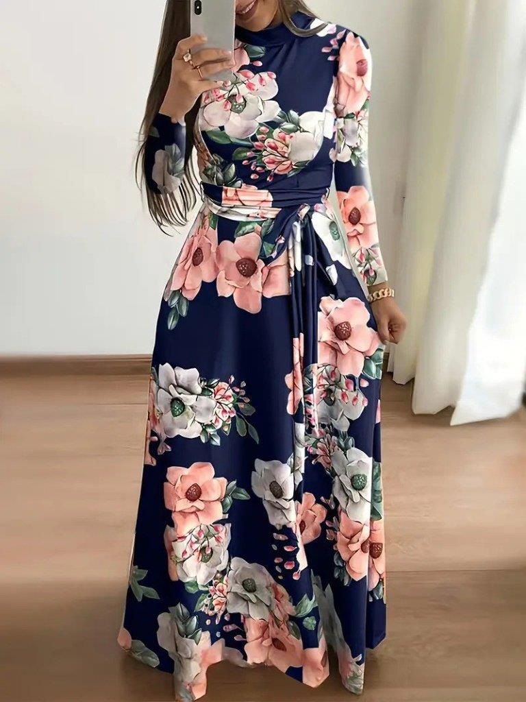 Kadın Uzun Kollu Yuvarlak Yakalı Beli Kuşaklı Desenli Süprem Uzun Elbise