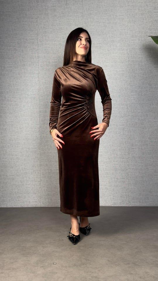 Kadınbalıkçı Yaka Büzgü Ve Taş Işleme Detay Maxi Boy Kadife Elbise
