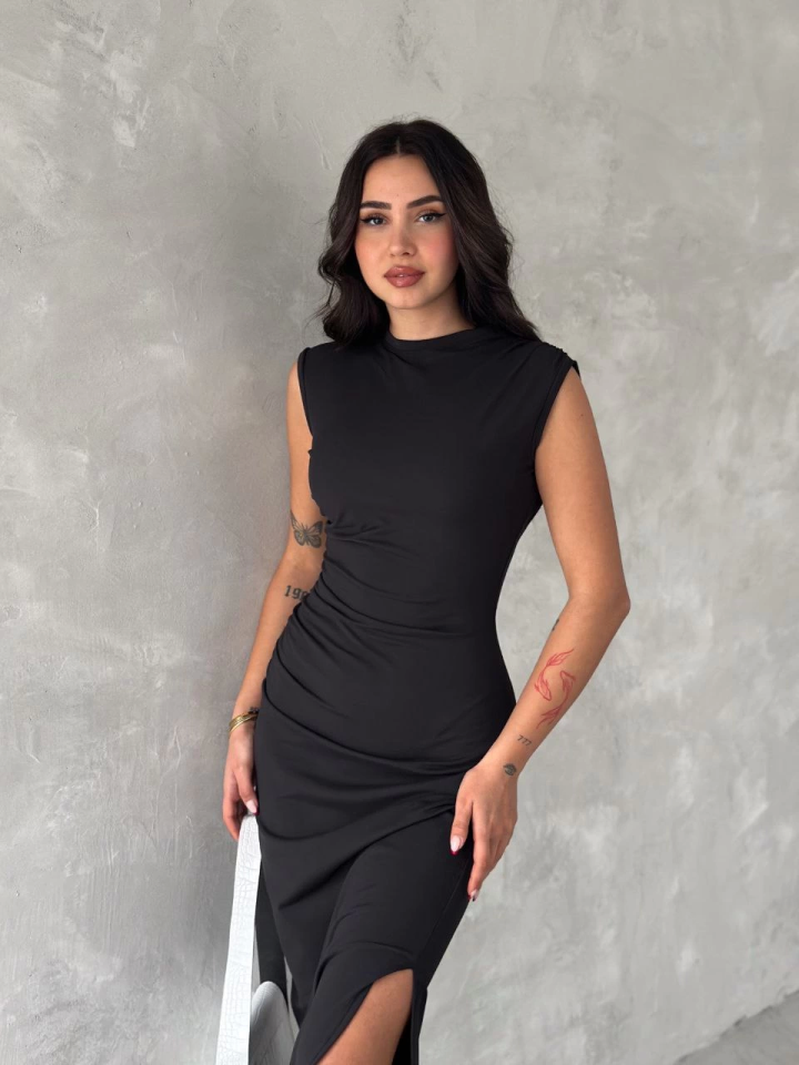 Kolsuz Yırtmaçlı Uzun Maxı Boy Elbise - Siyah
