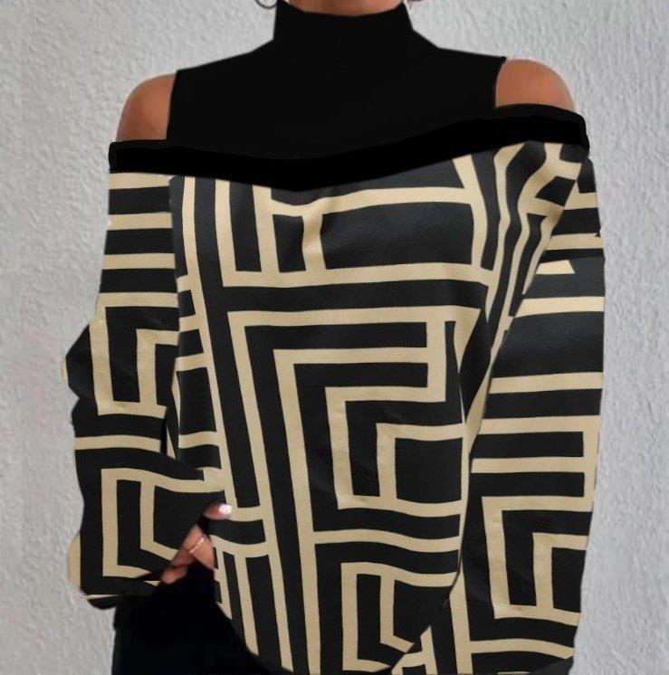 0Kadın Uzun Kollu Balıkçı Yaka Omuz Pencereli Labirent Dijital Baskılı şardonlu Dalgıçsalaş Bluz