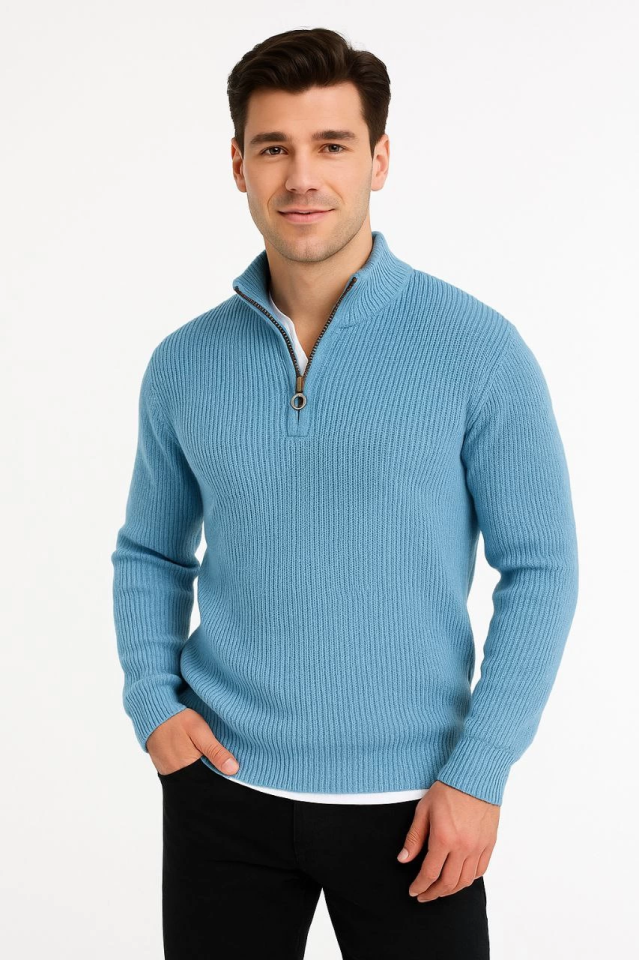 Erkek Yarım Fermuarlı Triko Kazak – Selanik Örgü, Dik Yaka, Pamuklu Dokuma, Regular Fit Uzun Kollu Kışlık Model - Bebe Mavisi