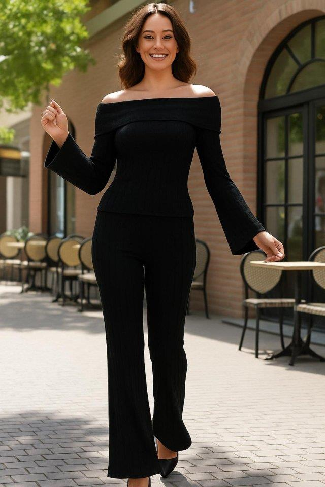 Kadın Uzun Kollu Madonna Döküm Yaka Bluz Ve Pantolon Ikili Takim