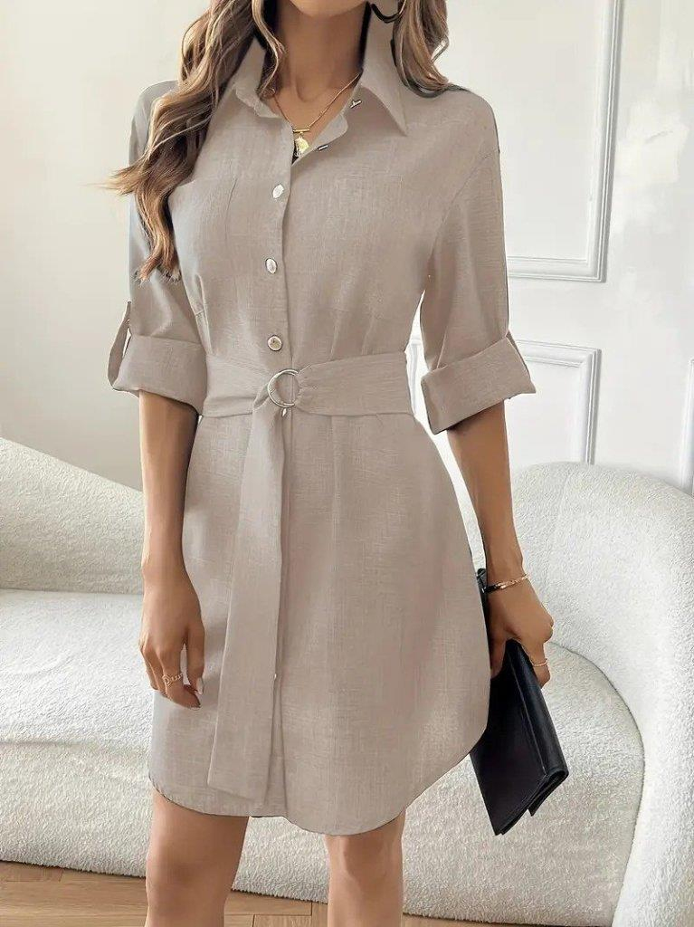 Kadın Uzun Kollu Yakalı önden Düğmeli Beli Kuşaklı Mini Ithal Keten Elbise